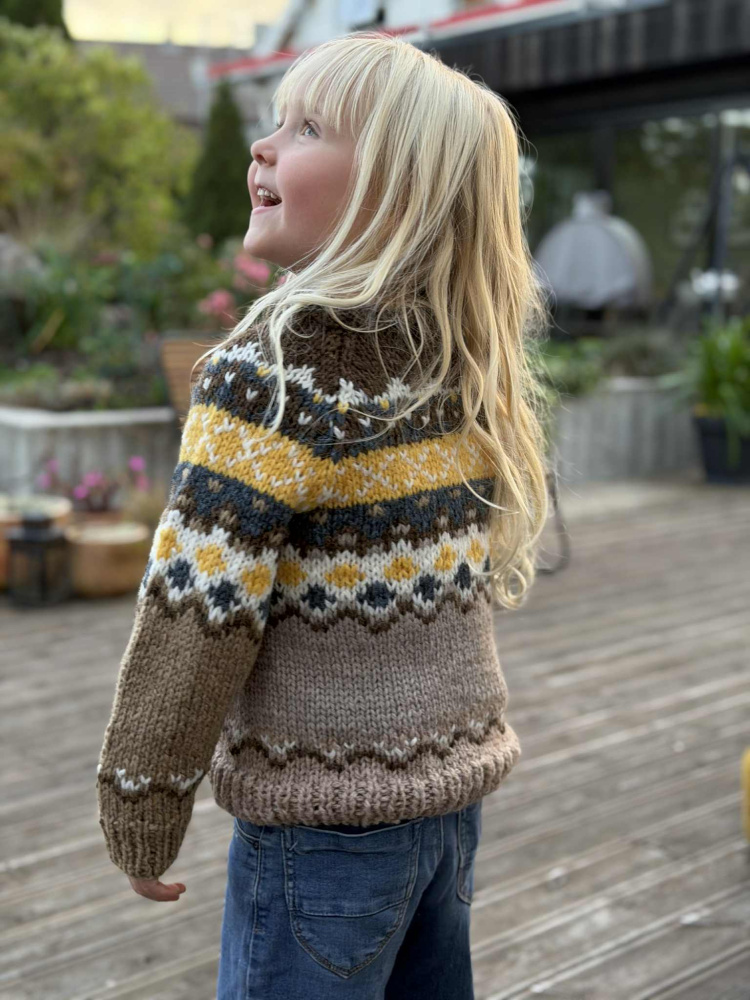 Helgholm-genser til barn er strikka i Rauma VAMS. Genseren er strikka med raglan nedanfrå og opp. Genseren på bilda er i størrelse 4 år. Oppskrifta finst i størrelse 2-12 år. Oppskrifta finst på norsk, engelsk, tysk, dansk og svensk.